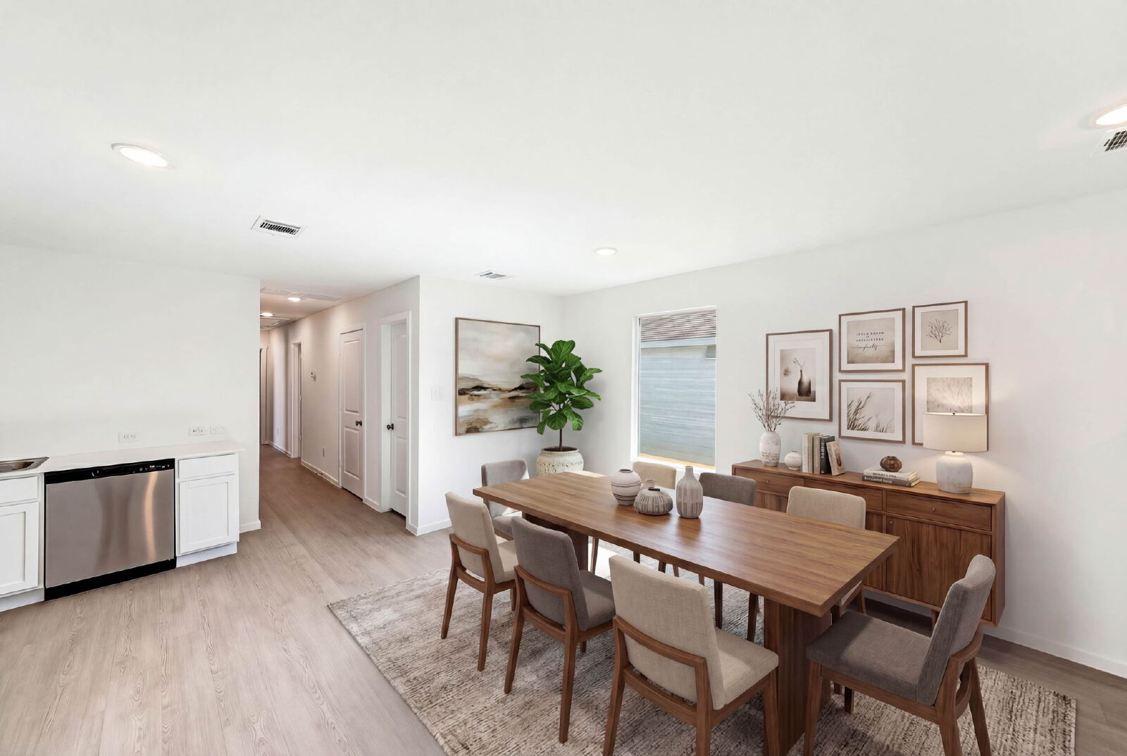 The heart of the home is an airy open plan living space where natural light pours in, making mornings feel fresh and evenings feel peaceful. Luxury vinyl plank flooring flows throughout, creating a clean and modern look that is as durable as it is beautiful. Imagine starting your day with sunlight streaming across the floors as coffee brews in the kitchen, or winding down in the evening with soft lighting and a sense of ease that only a thoughtfully designed space can provide.