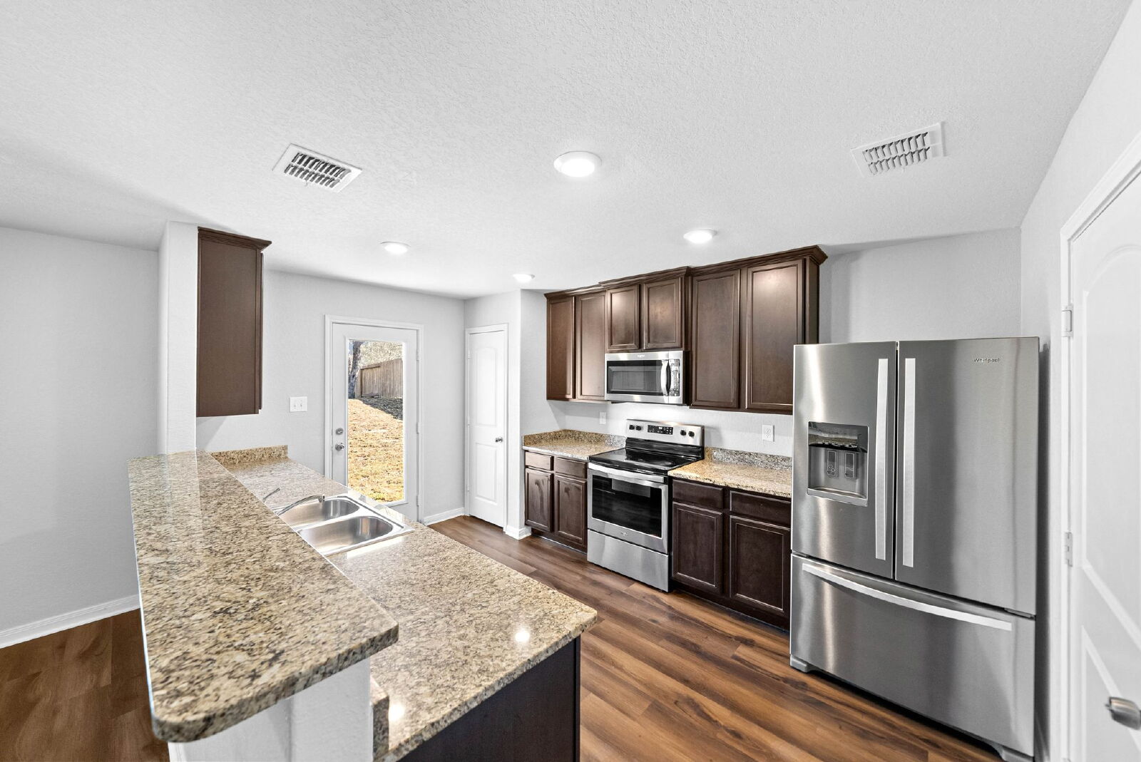 The kitchen is both functional and inviting, featuring sleek stainless steel appliances and an oversized bar top that quickly becomes the favorite gathering spot. Mornings begin here with quick breakfasts and shared plans for the day. Evenings end with casual meals, homework sessions, or a glass of wine while dinner comes together. It is a space designed for connection, whether you are cooking for one or entertaining many.